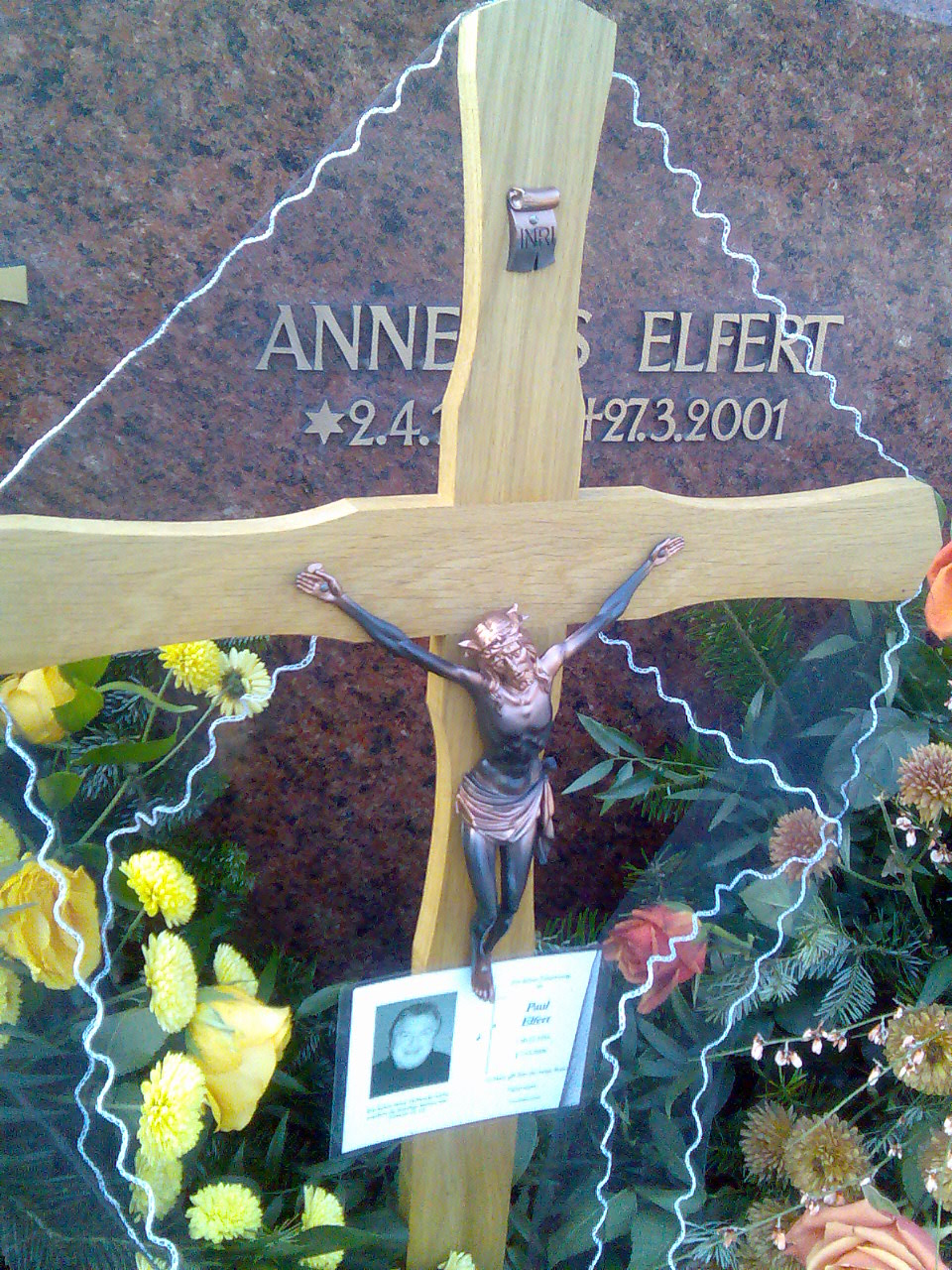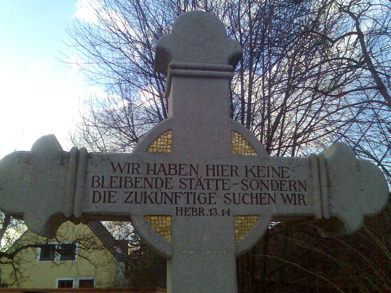 Als ich schon am gehen war, sah ich jemand das Kreuz neben Pauls fotografieren. Ich kehrte um, weil ich wissen wollte, was da so interessant sei. Es ist das Kreuz der Heimatvertriebenen, und darauf steht der gleiche Spruch, wie auch auf dem Sterbebild Innenseite: Wir haben hier keine bleibende Stätte, ... (letztes Bild).